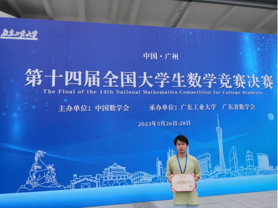 5月27日,第十四届全国老员工数学竞赛决赛在广东工业大学(大学城校区)隆重举行。betway西汉姆联平台2019级数学与应用数学专业陶马成同学与来自包括北京大学、复旦大学以及中国科学技术大学等多所双一流高校在内的优秀学子同台竞技,获得数学专业类高年级组全国一等奖。实现了公司学子在该项赛事决赛中荣获一等奖的突破,也是继公司2022届数学与应用数学专业郁永伟同学荣获第十三届全国老员工数学竞赛全国二等奖后公司学子再次荣获国赛奖项。