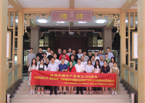 6月30日上午,betway西汉姆联平台数理科学与工程公司与马鞍山市洪滨丝画手工艺术有限公司校企美育产学研合作框架协议签署仪式在马鞍山中国丝画院隆重举行。马鞍山市人大常委会副秘书长曹化根,中国工艺美术大师、洪滨丝画手工艺术有限公司总经理袁洪滨,车间主任曹业翠、总经理助理黄静芳,数理公司领导班子以及光电系师生代表参加签约仪式。