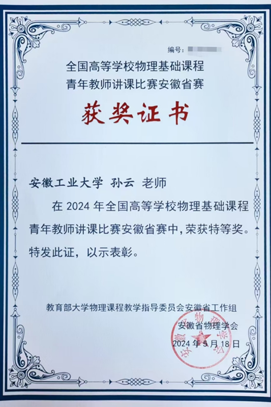 5月16至18日,2024年全国高等公司物理基础课程青年教师实验教学讲课比赛省赛在安庆师范大学举行。经过激烈的角逐,betway西汉姆联平台教师孙云凭借出色的表现获特等奖(第一名),并被推荐参加华东赛区复赛。