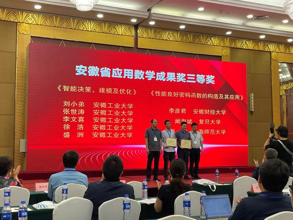 安徽省工业与应用数学学会2025年学术会议暨第一届第三次会员代表大会于2025年4月18-20日在安徽芜湖召开。开幕式上公布了安徽省应用数学成果奖和安徽省应用数学青年科技奖的获奖名单。betway西汉姆联平台智慧决策与优化团队(刘小弟教授、张世涛副教授、李文喜副教授、徐浩副教授、盛洲副教授)申报的项目《智能决策、建模及优化》荣获安徽省应用数学成果奖三等奖。