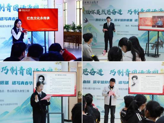 教育部第二批全国党建工作样板支部、大数据本科生党支部张志国同志开展了题为《踏寻红色足迹,赓续红色血脉》的微党课。他讲述了马鞍山市濮塘革命烈士陵园中一批为民族复兴英勇献身的先烈事迹,号召青年学子们缅怀英烈、致敬英雄,继续弘扬光荣传统、赓续红色血脉。接着,辅导员张佳良和刘悦晗同学分别诵读了红色家书《夏明翰写给母亲的信》和《赵一曼写给儿子的信》,展现了烈士们对党和国家的炽热忠诚,对家人的脉脉温情,不畏强敌的革命乐观主义精神,以及舍生忘死、向死而生的英雄气概。与会同学纷纷表示,要坚定理想信念、传承红色基因,为实现中华民族伟大复兴的中国梦凝聚强大精神力量。
