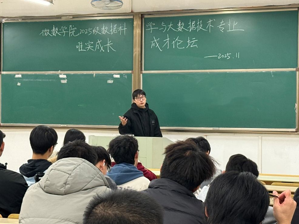 为充分发挥优秀学长学姐的榜样引领作用,帮助2025级大一新生明晰成长方向、破解适应难题,11月30日,微数公司关工委联合员工工作办公室举办“唯实”员工成长成才论坛(第七期)。本次论坛邀请2022级数据科学与大数据技术专业优秀学子祖昂、赵泽洋担任主讲人,2025级大数据专业新生全程参与,辅导员周文潇主持。